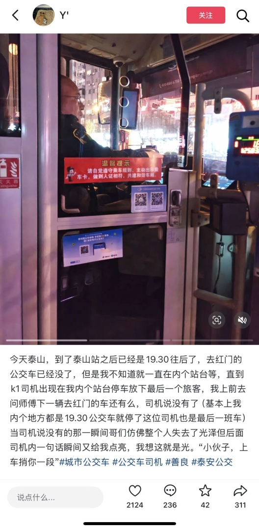 近日,泰安公交1路駕駛員律發(fā)彬的暖心事跡在網(wǎng)絡(luò)上引發(fā)熱烈反響,眾多網(wǎng)友紛紛點(diǎn)贊留言,稱贊“泰安太暖心了!”。這一切源于3月25日晚一場觸動人心的美好相遇。