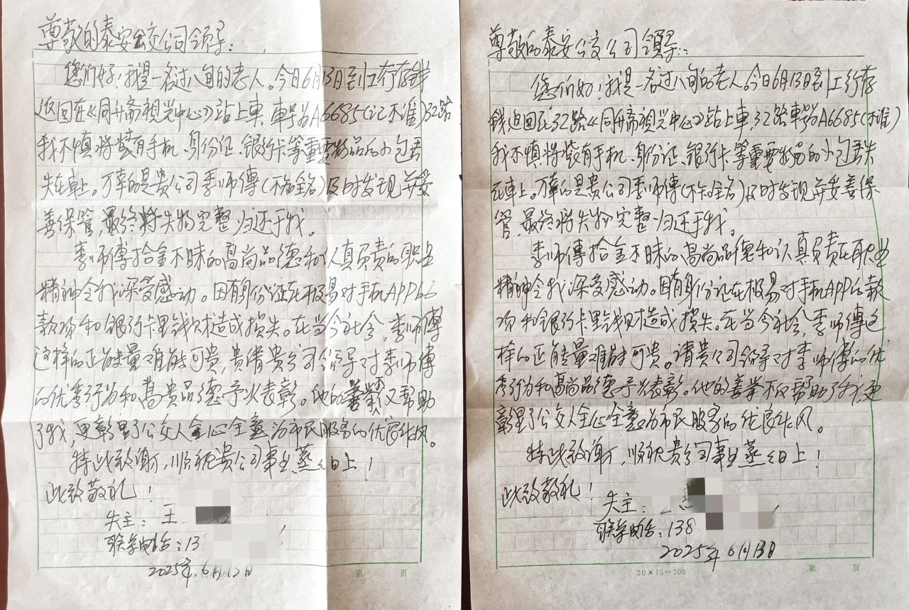 當天,王大娘順利領回失物。她感慨道:“李師傅不僅拾金不昧,還主動聯(lián)系、妥善保管,讓我這八旬老太太心里特別暖。”為表謝意,老人特意手寫感謝信,一份致謝公交公司,一份致敬李師傅,用質樸的文字傳遞社會正能量。
