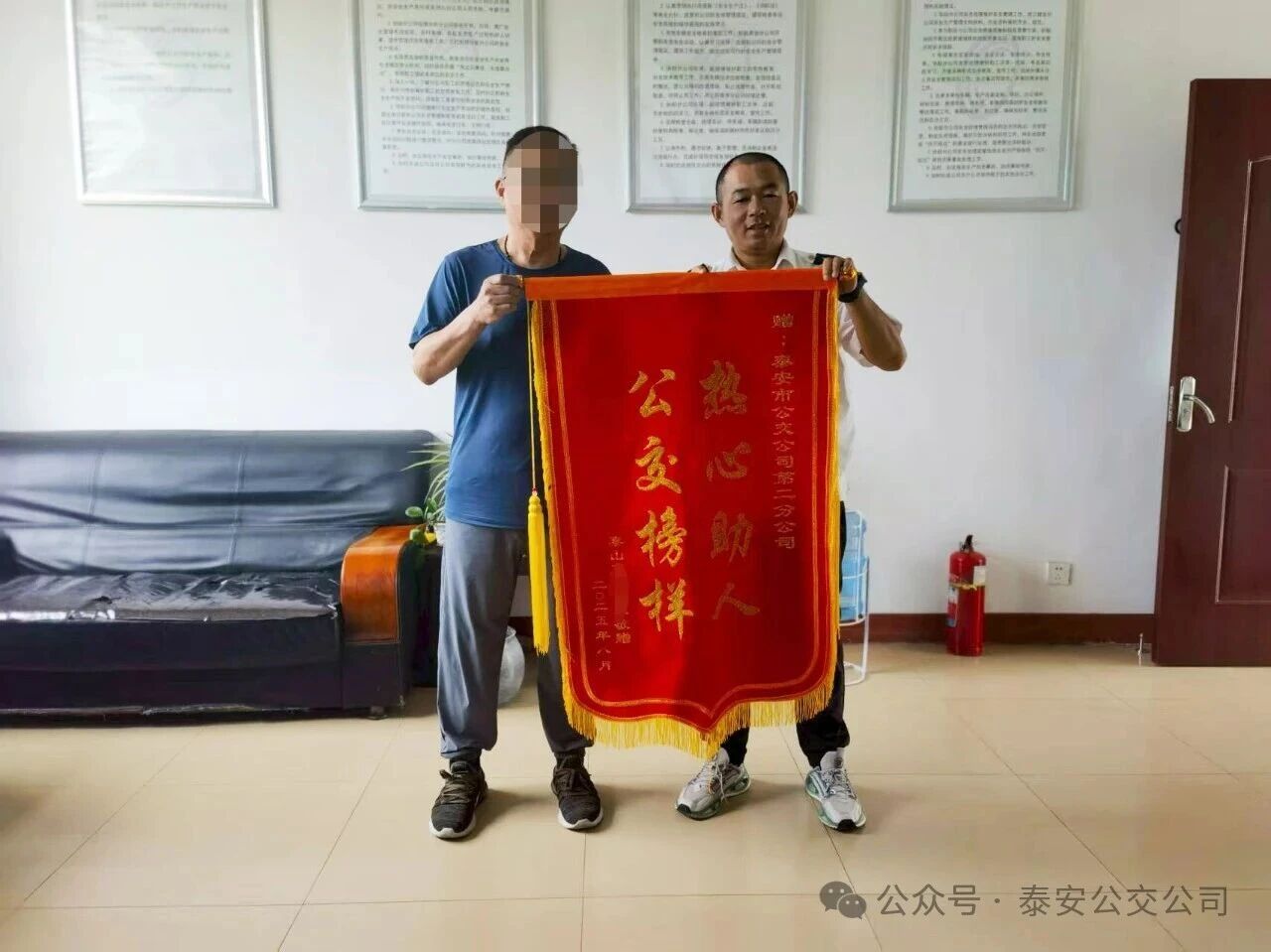 9月4日下午,泰安公交第二分公司辦公室迎來了一位特殊的訪客——市民方先生。他手捧一面鮮艷的錦旗,專程前來尋找并感謝曾在危難之際向他伸出援手的兩位公交人:分公司保衛(wèi)值班人員李潛和26路駕駛員李斌。