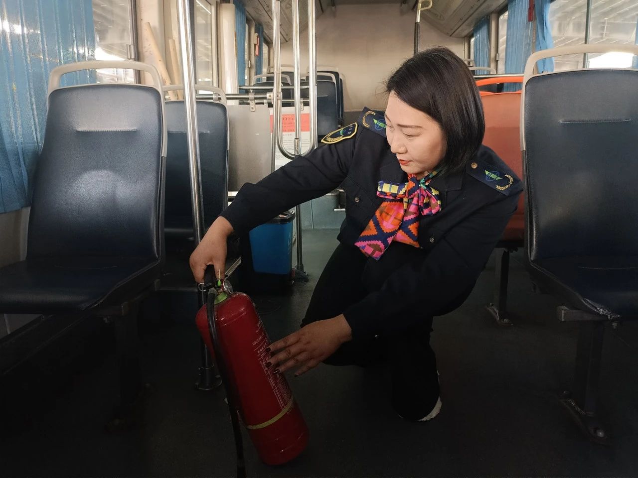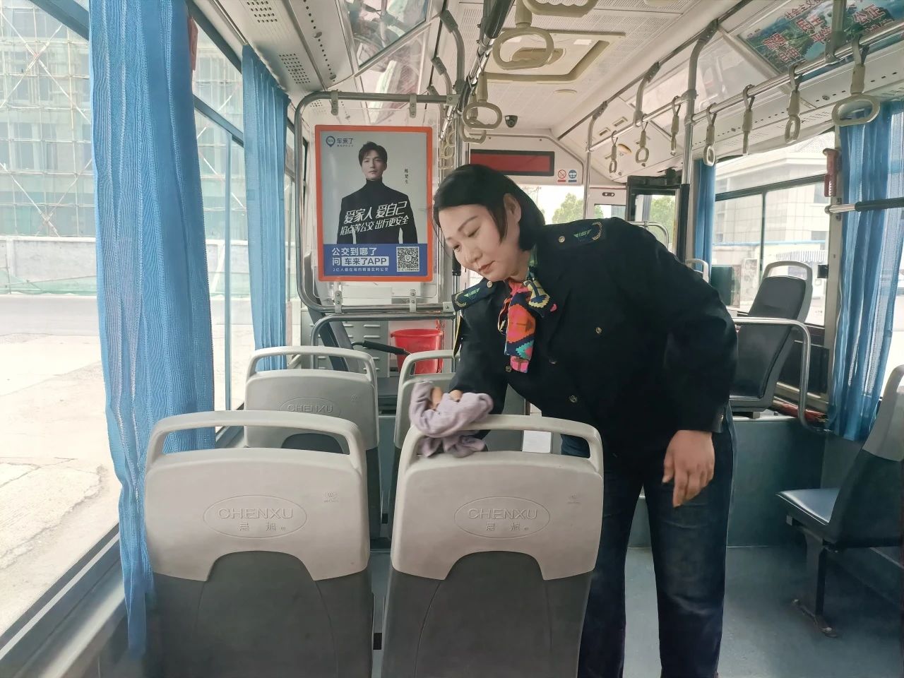 下午4點(diǎn),陽光還未褪去熱度,楊如苓已蹲在車廂里擦拭地板。“夜間乘車視線差,得讓乘客一上車就看清楚腳底下。”她仔細(xì)清理座椅縫隙間的雜物,連滅火器表面都擦得很干凈。